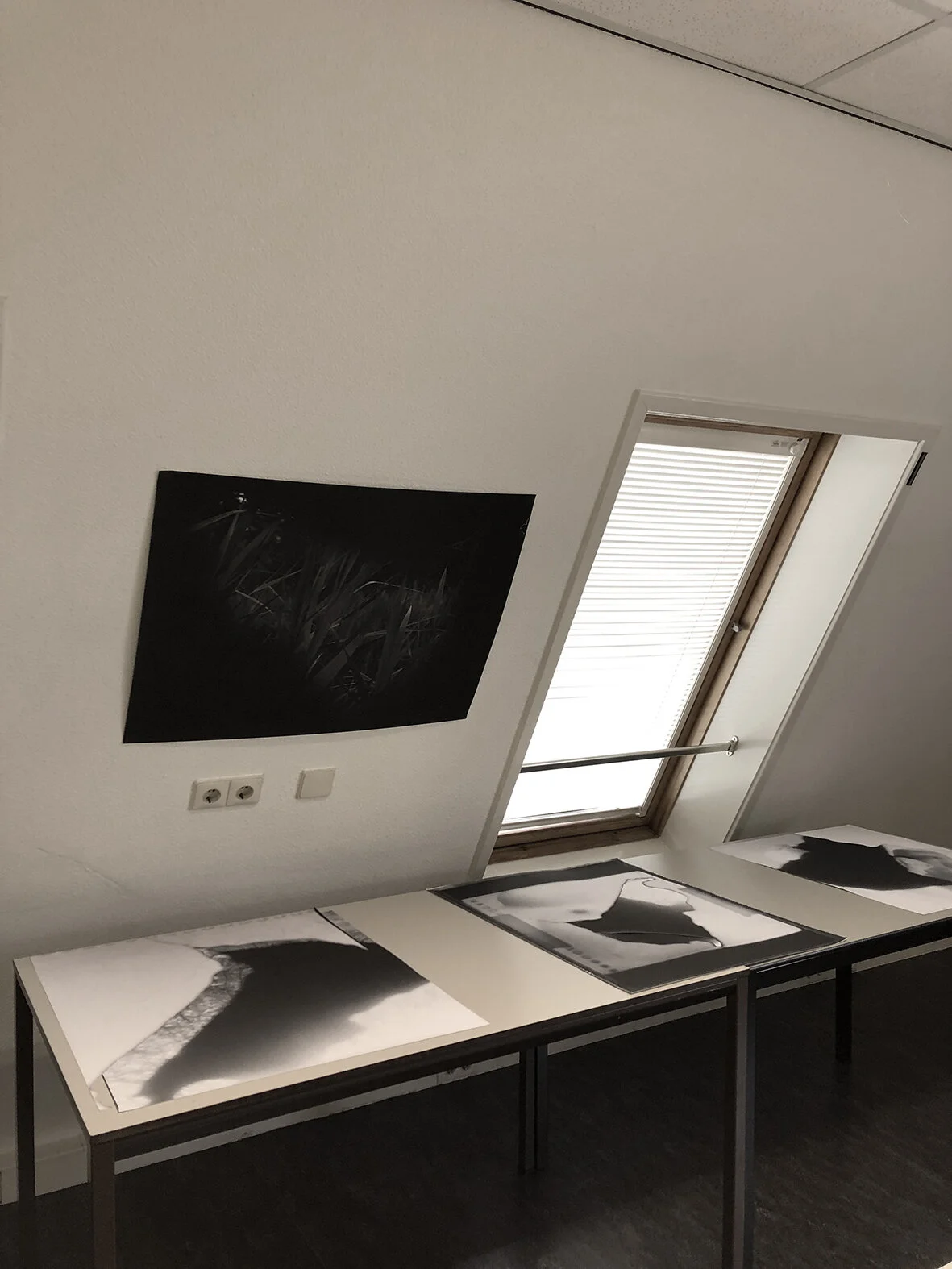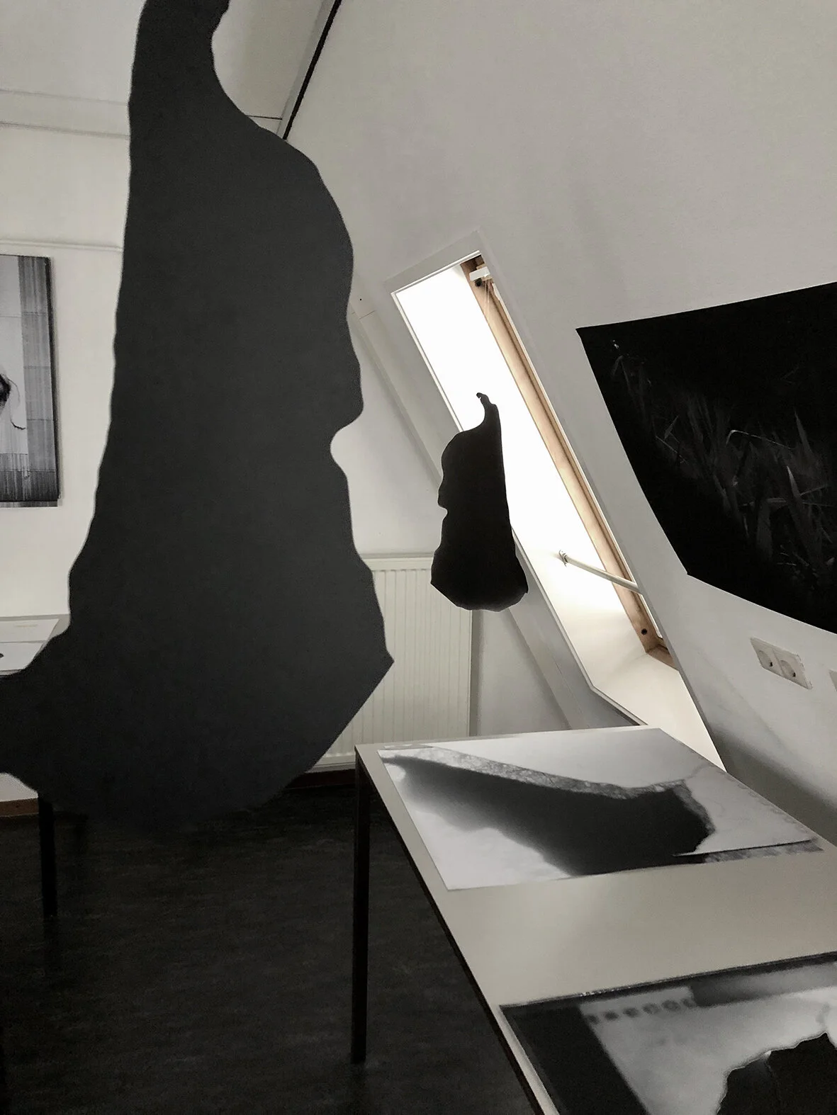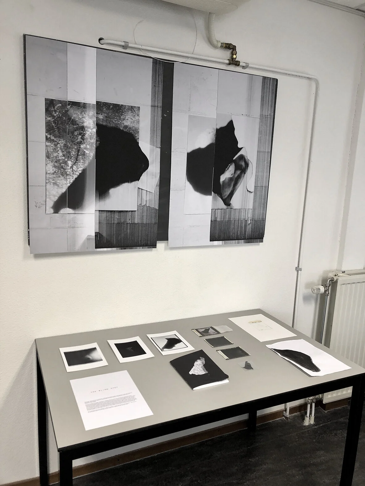 I started building in my blind spot into my camera, because that is how I look as photographer, through my camera. From this trial and error phase, I started to cut out the spot, positive and negatives shapes, filming the spot, blowing it up until big proportions, using it rest material and placing spot on spot. Trying to find his shape and experimenting with moving it.